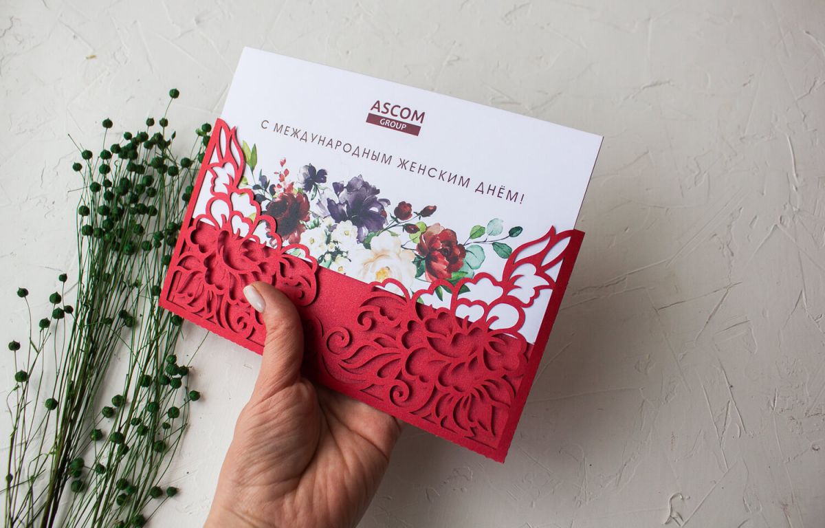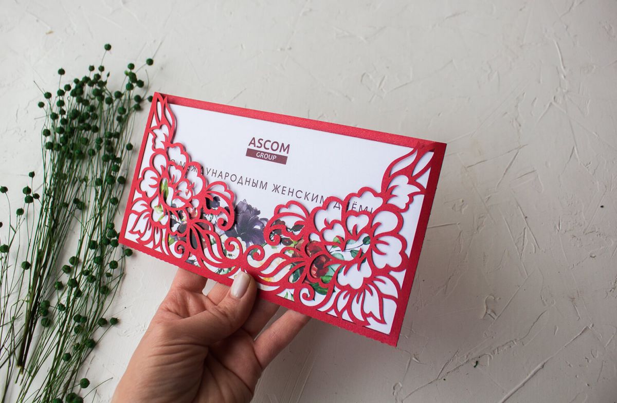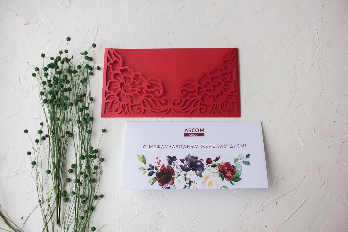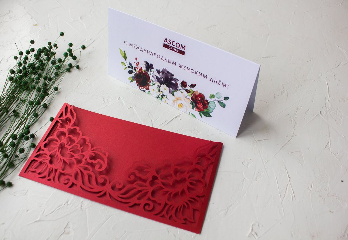 Классическая открытка с ажурным конвертом, выполненным лазерной резкой. Возможно дополнение логотипом.
