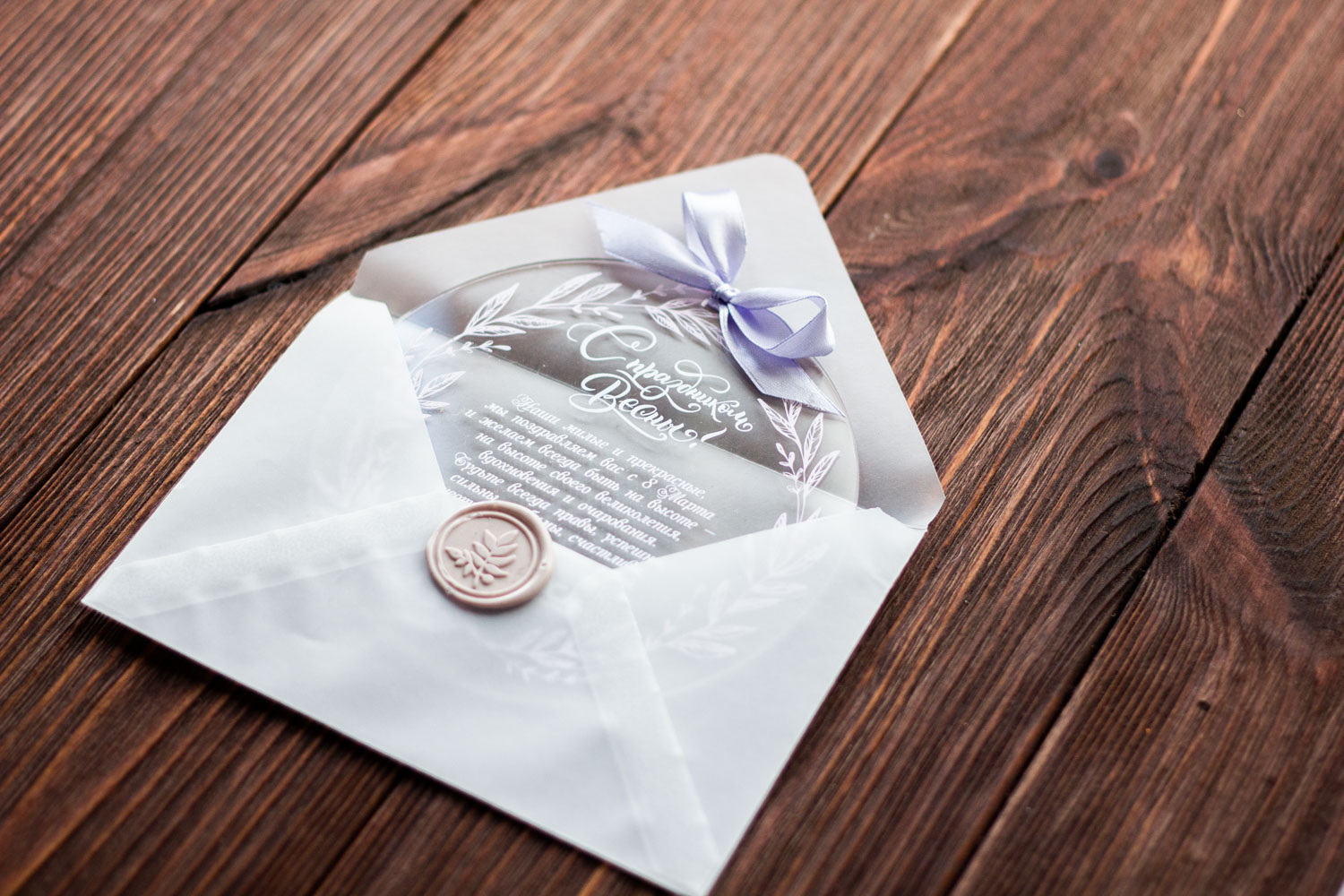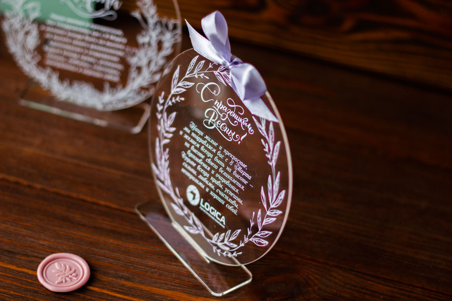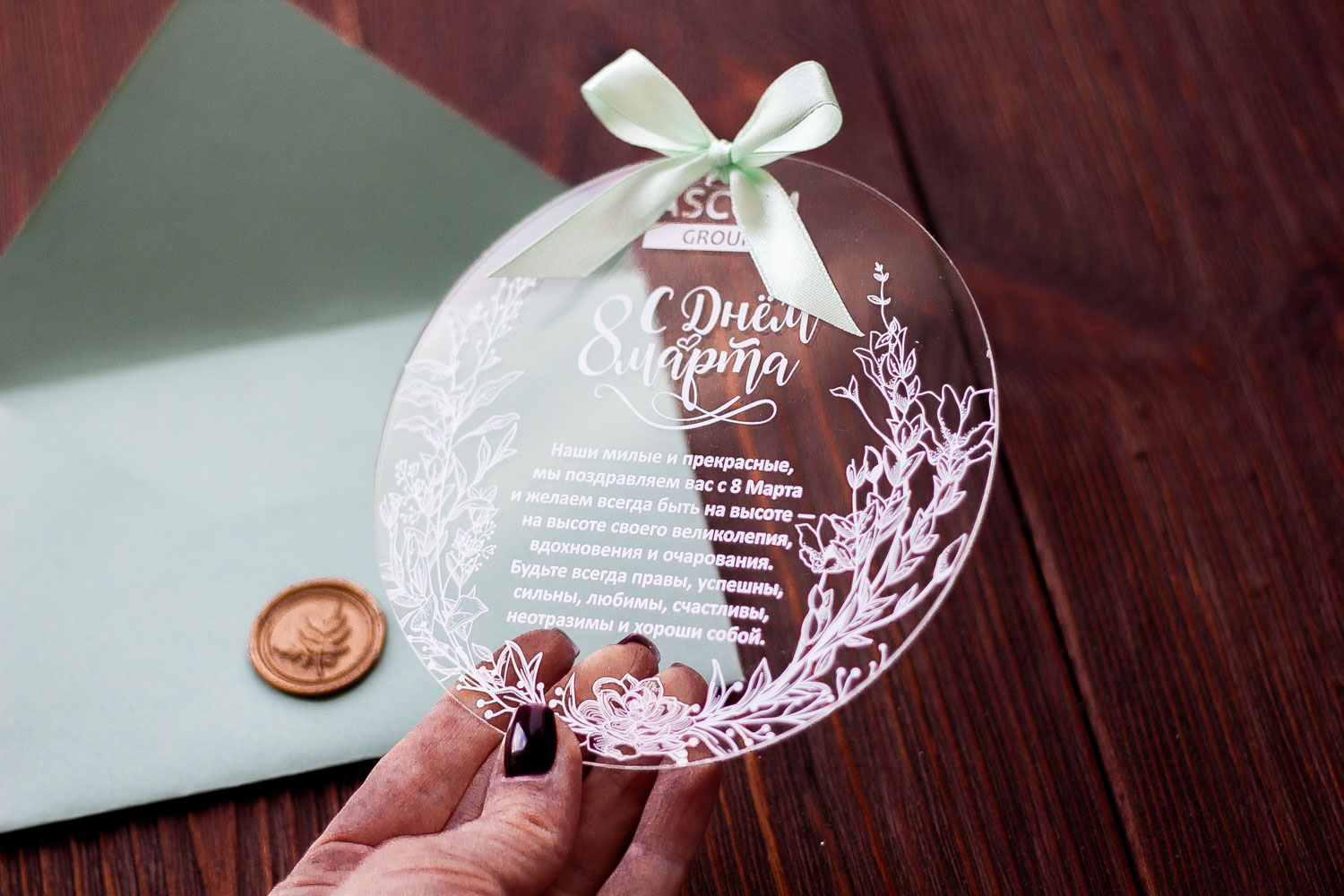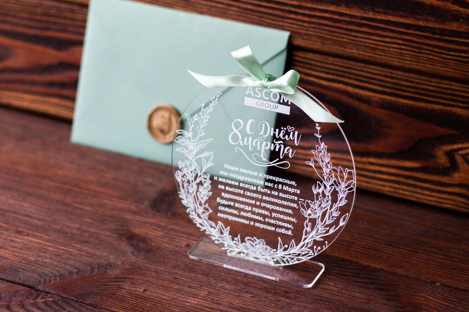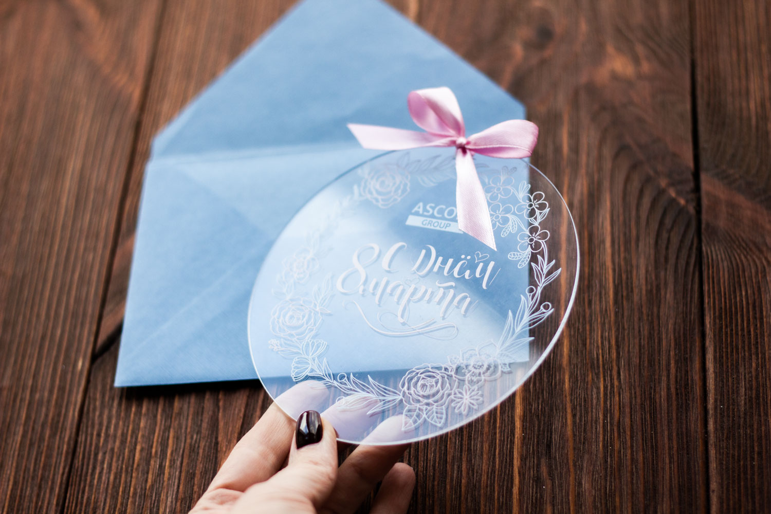 Эта прозрачная, легкая и оригинальная открытка из акрила подчеркнет ваше уважение и внимание к женщинам в вашей компании и среди партнеров. В сочетании с дизайнерским конвертом, она создает впечатление презентабельного и запоминающегося поздравления высокого уровня.