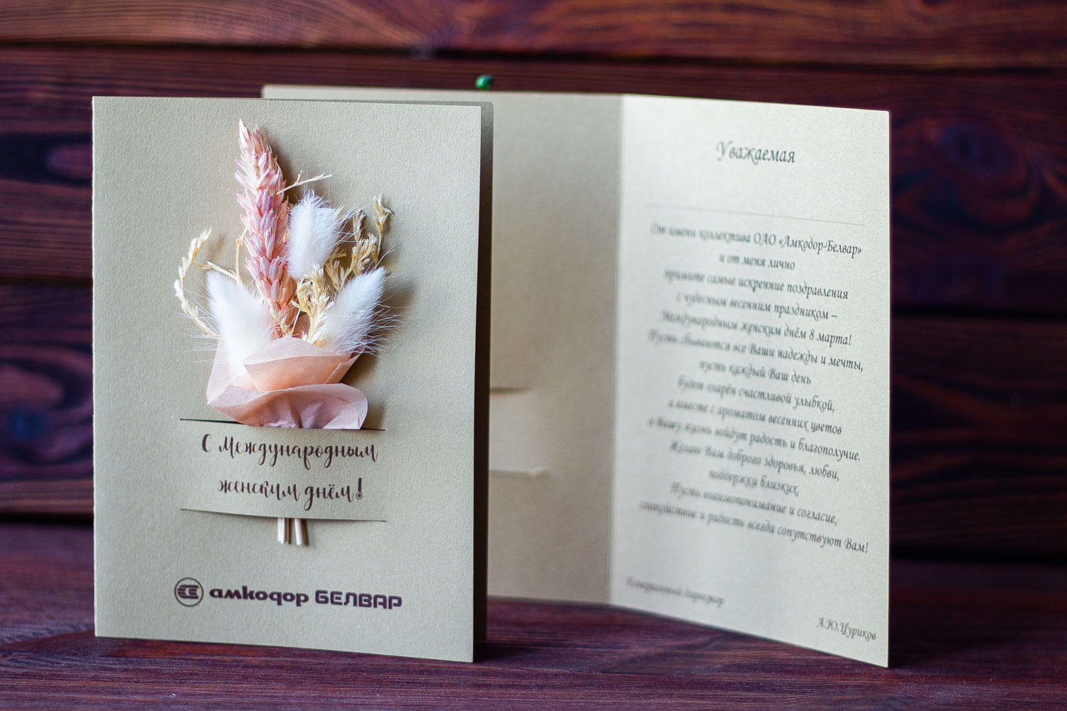 Эта открытка отличается выразительной трехмерной композицией — букет из сухоцветов, гармонично дополненный изящным дизайном на качественной дизайнерской бумаге. Размер открытки 13×18 см позволяет эффектно разместить как поздравительный текст, так и фирменный знак компании, что повышает ее имиджевую ценность.