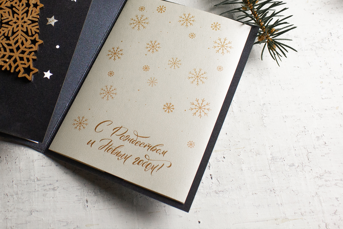 Опытные копирайтеры разработают лаконичное и стильное поздравление, соответствующее премиальному позиционированию открытки. Текст гармонично впишется в темный дизайн, подчеркнет индивидуальность вашего бренда и создаст нужный эмоциональный отклик у получателей корпоративных подарков.