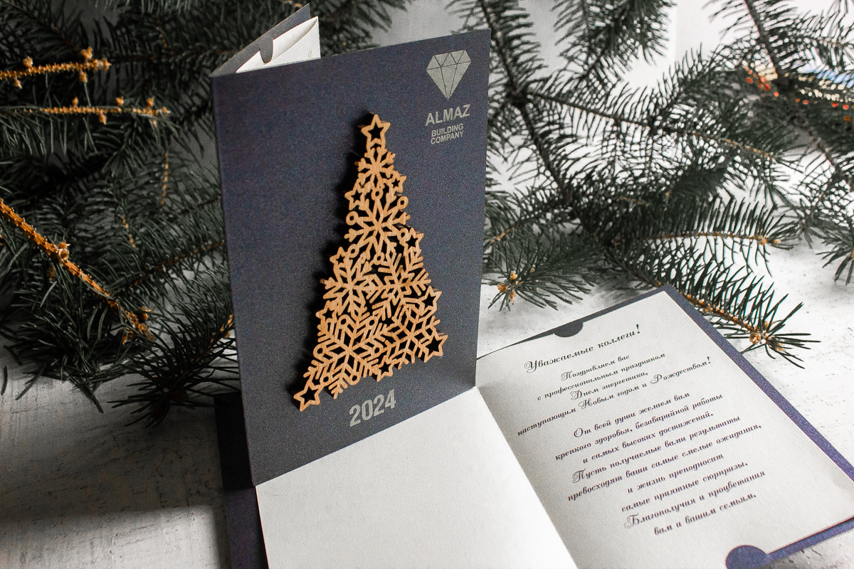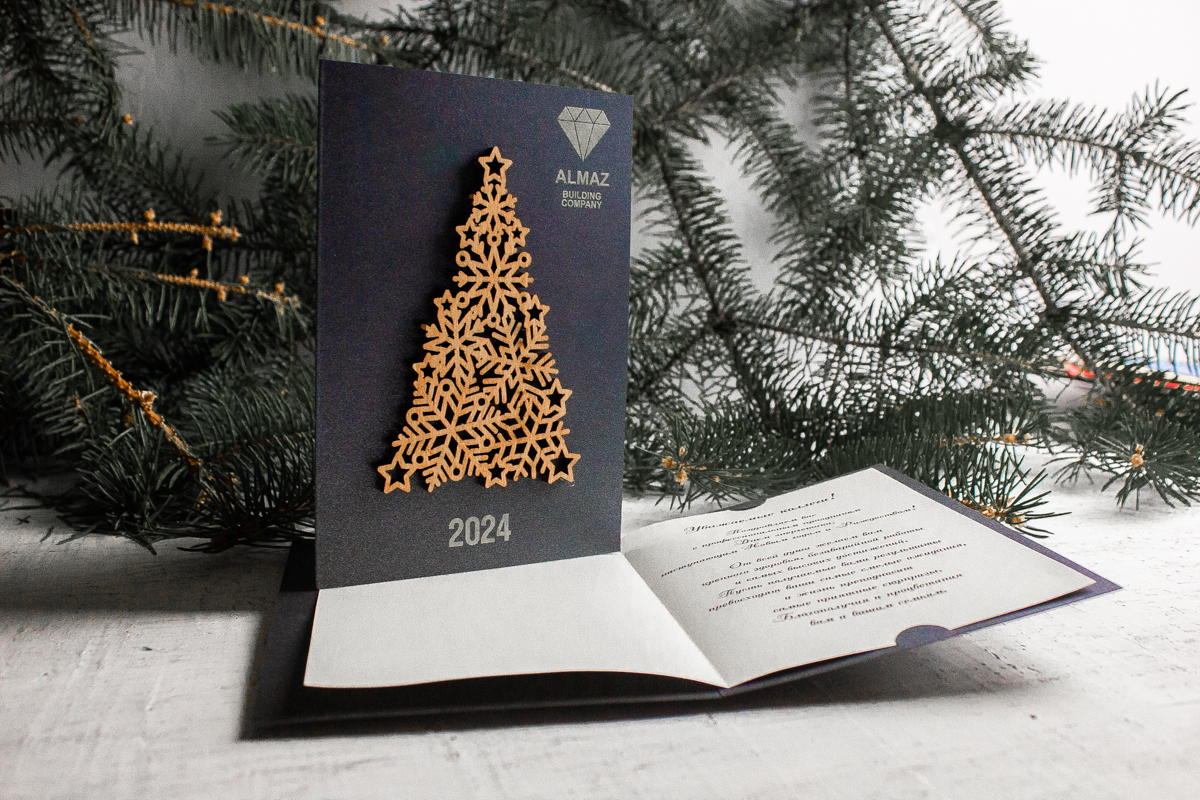 Производство премиальных открыток с деревянными элементами осуществляется на профессиональном оборудовании под контролем технологов. Каждая елочка вырезается лазером по индивидуальному макету, а темная дизайнерская бумага тщательно подбирается для создания максимального визуального эффекта и долговечности изделия.