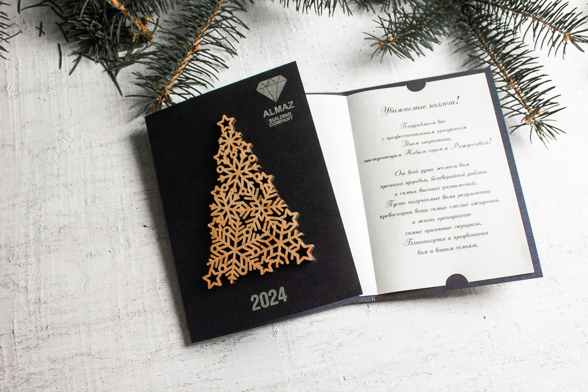 Изысканная новогодняя открытка премиум-класса на темной дизайнерской бумаге с объемной елочкой из натурального дерева, вырезанной методом высокоточной лазерной резки. Стильный минималистичный дизайн в темных тонах подчеркивает статус компании и создает атмосферу элегантности. Фигурная деревянная елка — классический символ Нового года — делает открытку запоминающимся корпоративным подарком для взыскательных клиентов и партнеров.