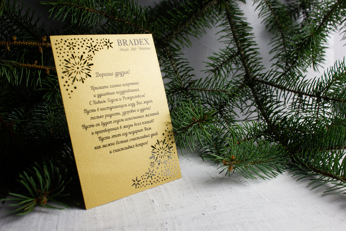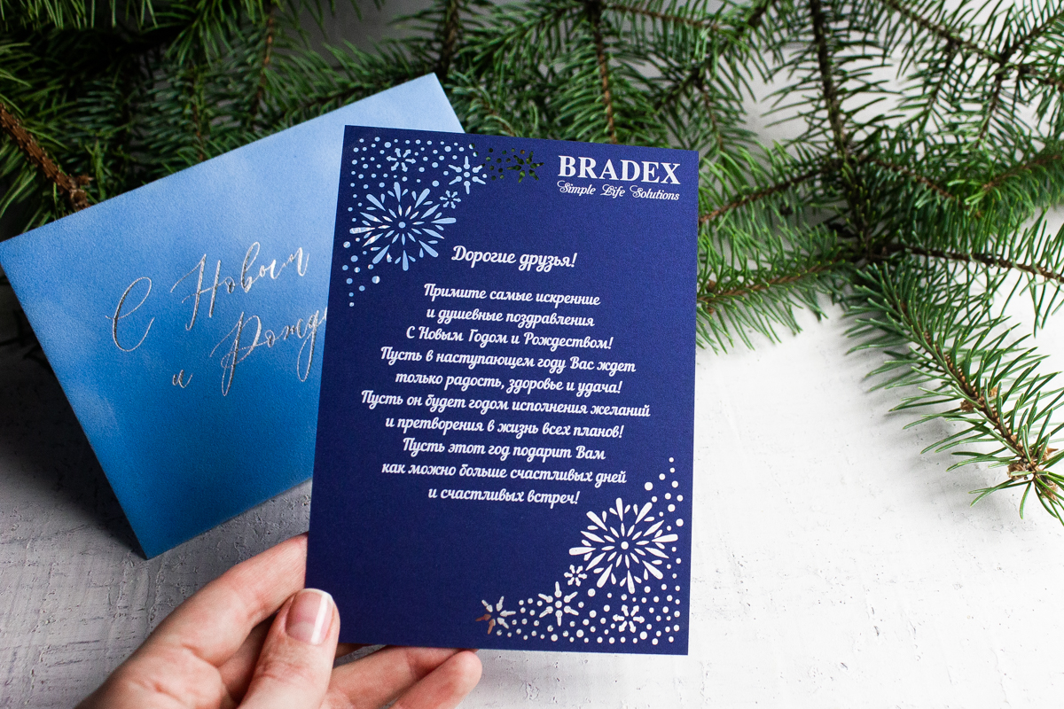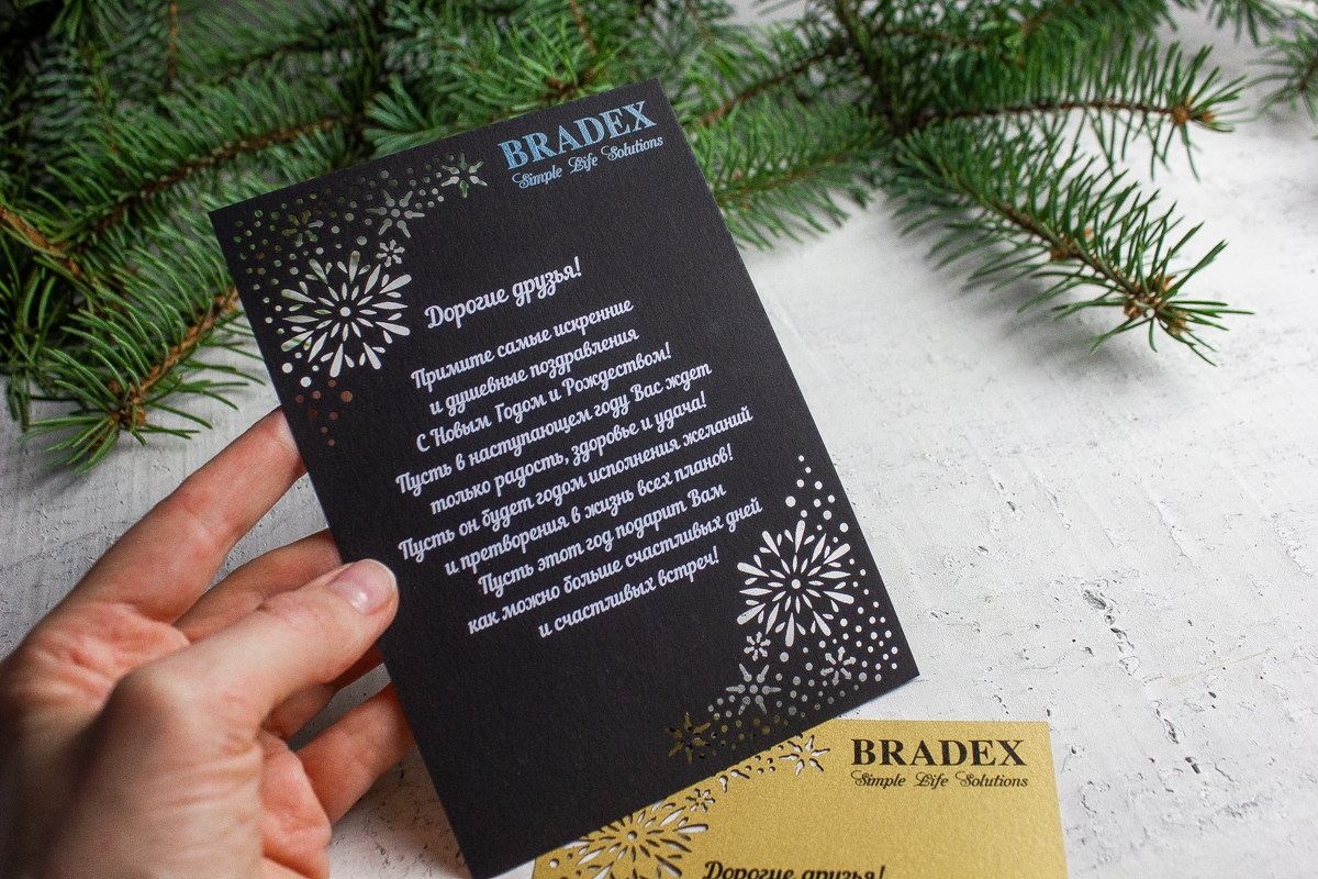 Премиальная новогодняя открытка с элегантным тиснением, разработанная специально для компании Bradex. Изготовлена из плотной дизайнерской бумаги с применением технологии рельефного тиснения логотипа, что придает поздравительной продукции статусный внешний вид. Такая открытка станет достойным корпоративным подарком для ключевых клиентов и деловых партнеров, подчеркивая профессионализм вашего бренда.