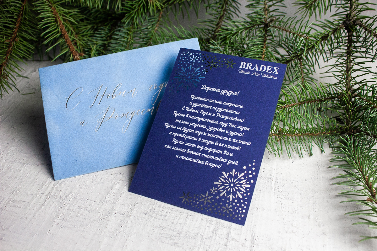 Новогодняя корпоративная открытка №81 с тиснением и логотипом Bradex