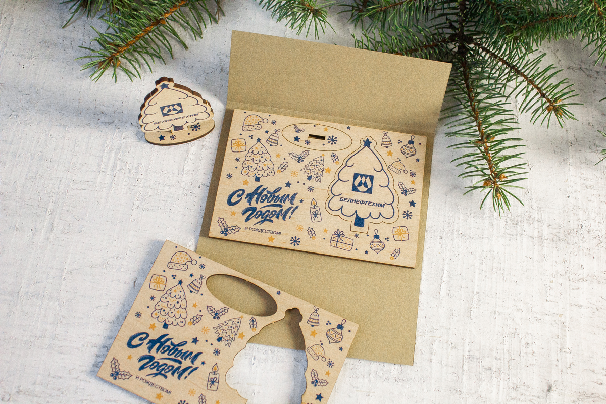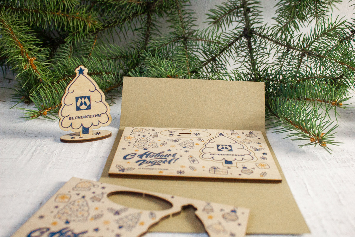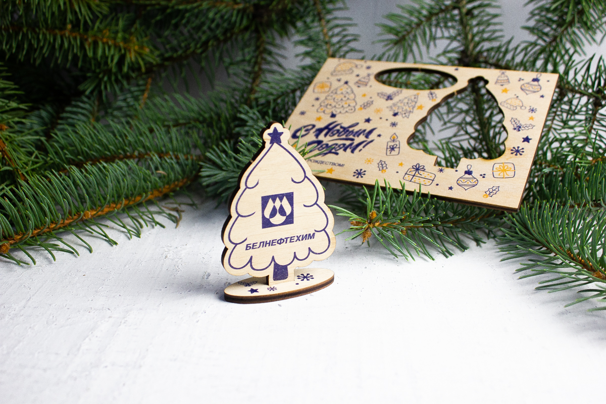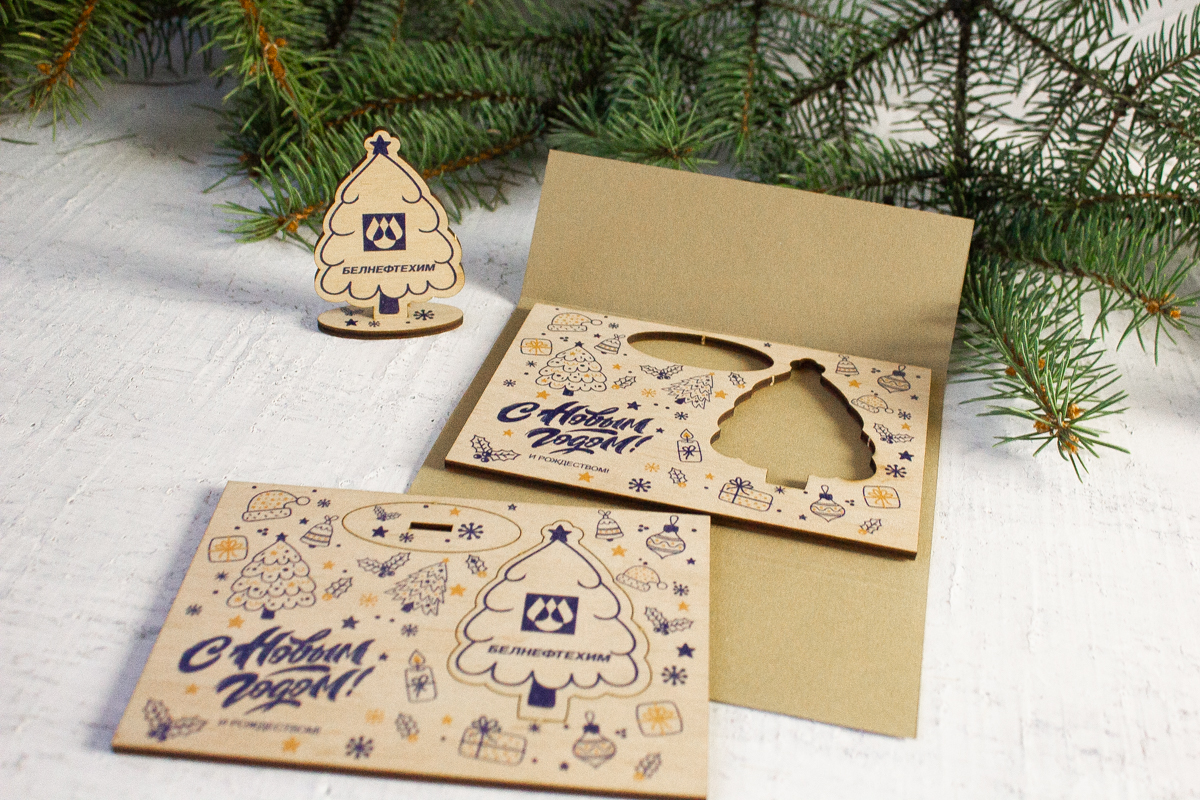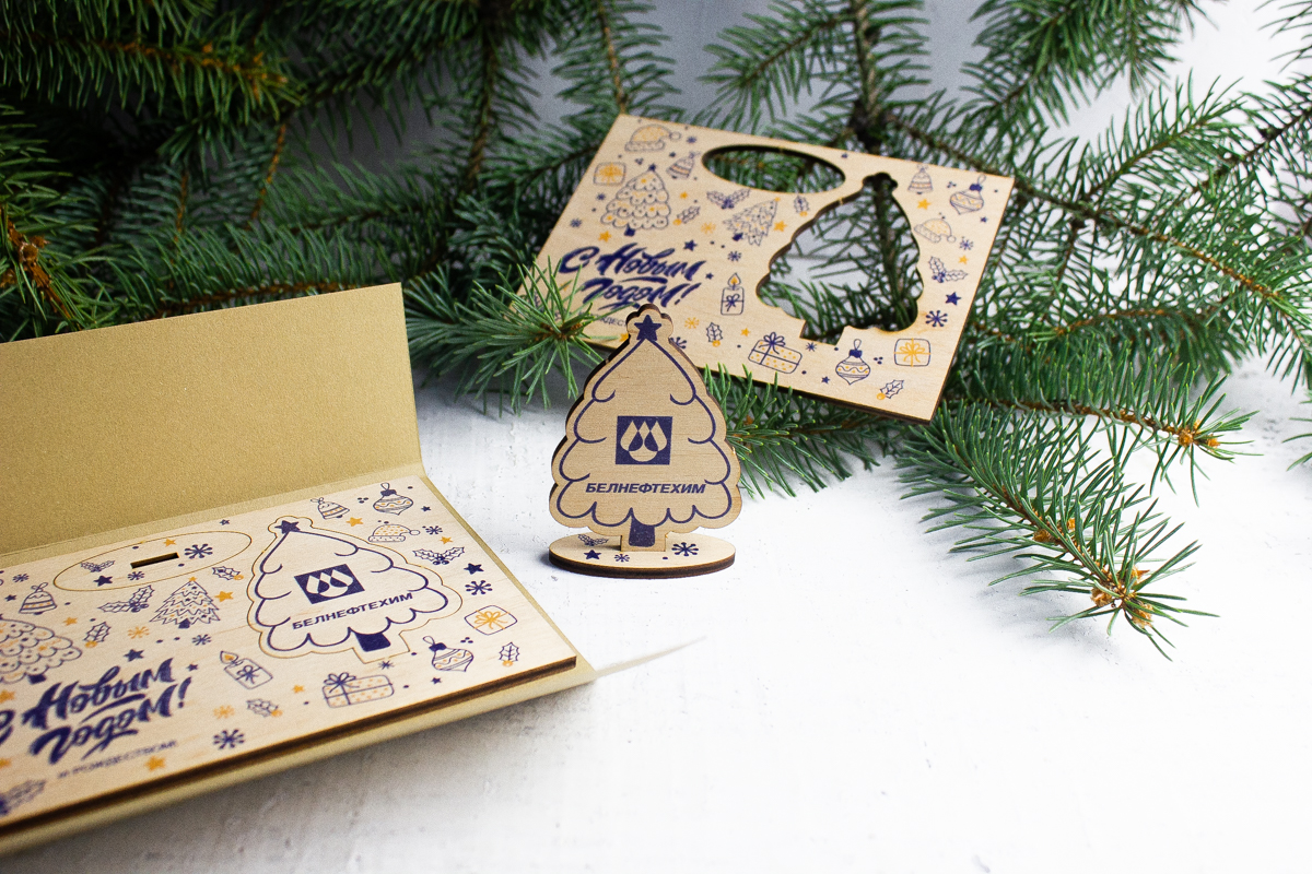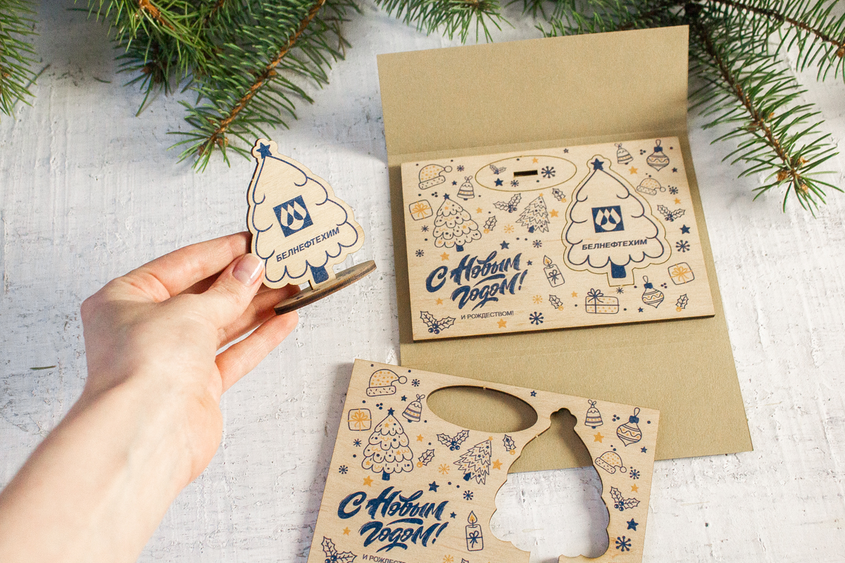 Эксклюзивная деревянная открытка с объёмной новогодней ёлкой, которая превращается в настольную фигурку-сувенир для рабочего стола или праздничного интерьера. Это уникальное решение «два в одном»: получатель читает поздравление и устанавливает ёлку на стол, где она создаёт праздничное настроение весь сезон.​