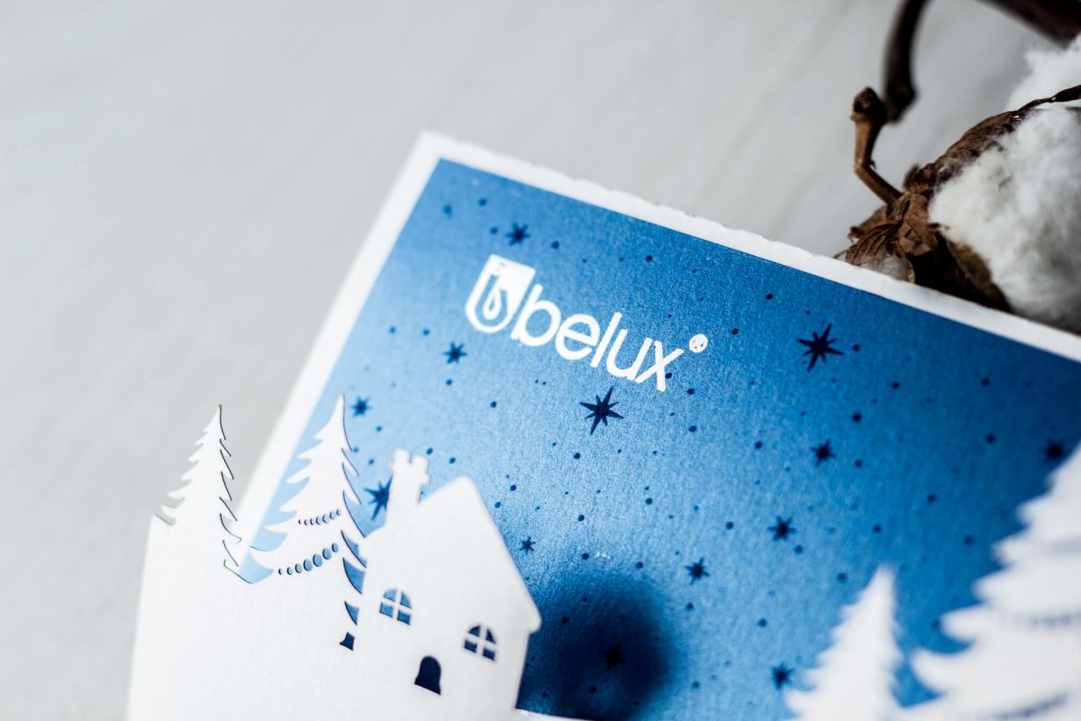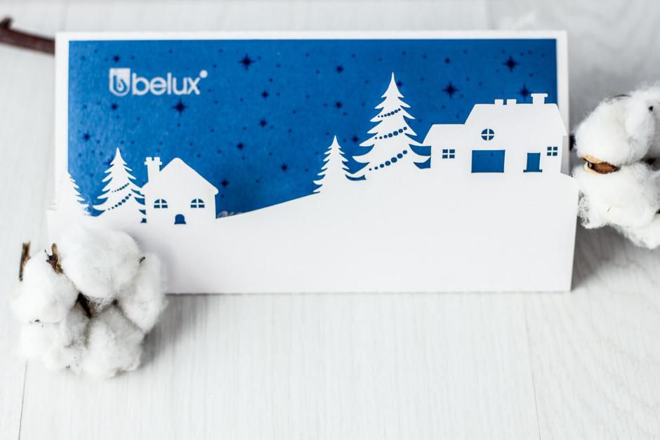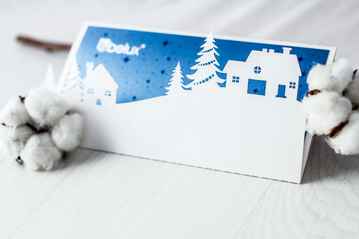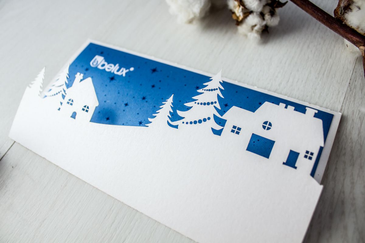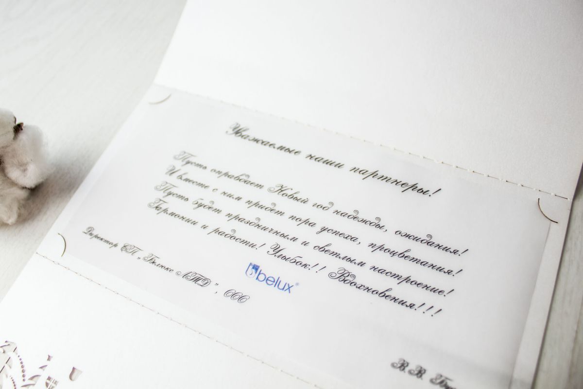 Открытка с логотипом Вашей компании выполнена лазерной резкой с новогодним пейзажем.