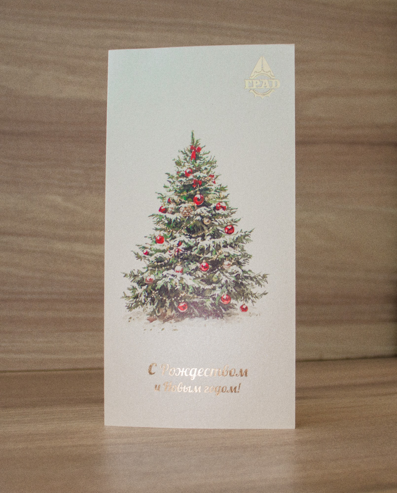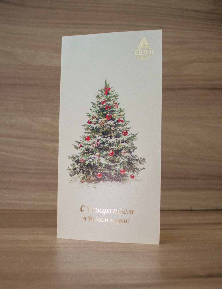 Открытка с изображением новогодней ели и золотым тиснением — элегантное корпоративное поздравление для партнеров и клиентов вашего предприятия. Технология тиснения фольгой придаёт открытке представительский статус и создаёт роскошное впечатление, выделяя её среди массовых поздравительных карточек.