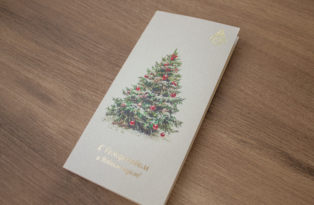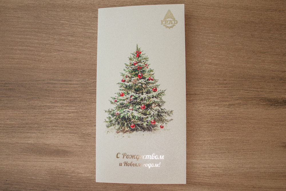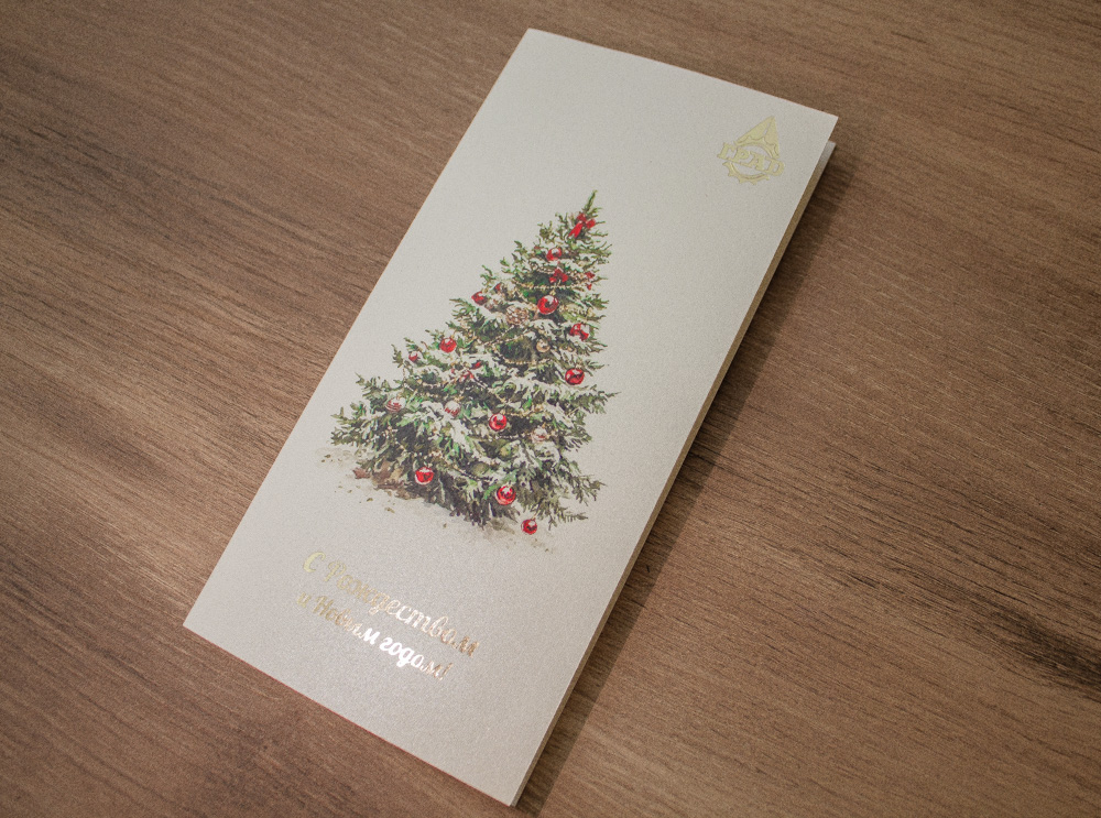 Изготовление новогодней открытки с тиснением золотом и ёлкой — премиум поздравление от компании